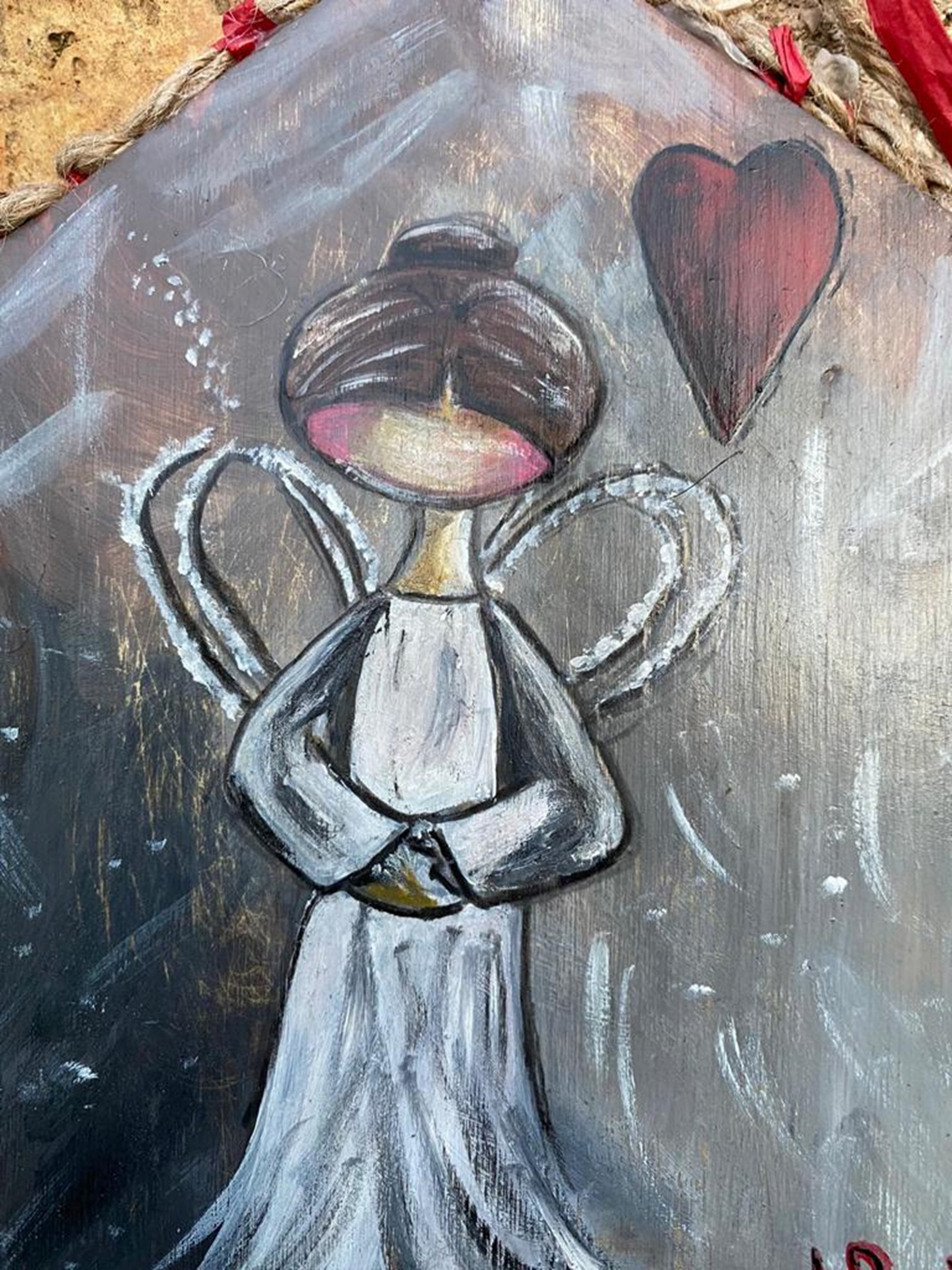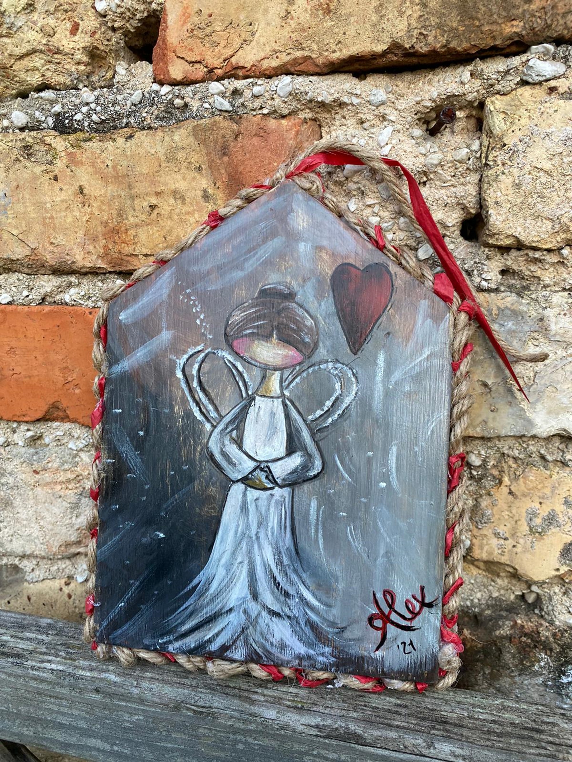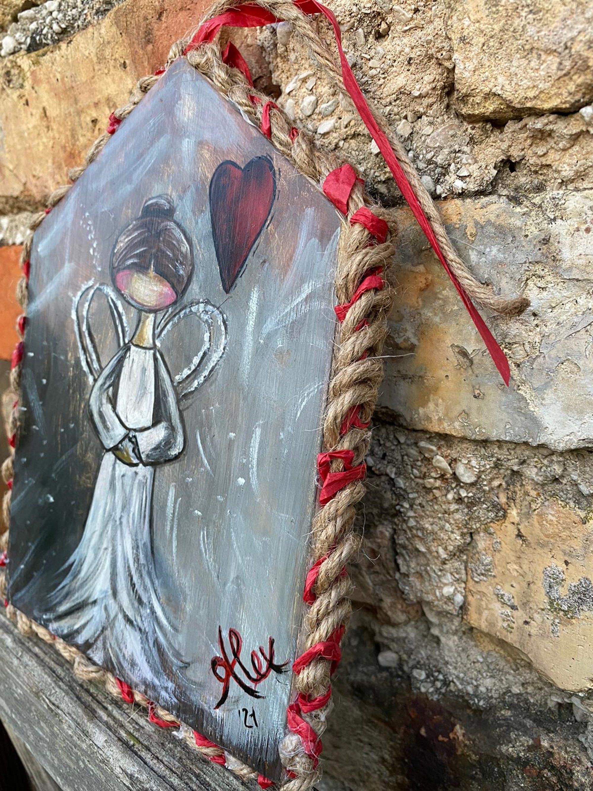 Mi piacciono gli angeli custodi, mi danno sicurezza quando li raffiguro e spero che veglino senza sosta su coloro che li appenderanno nella loro casa.