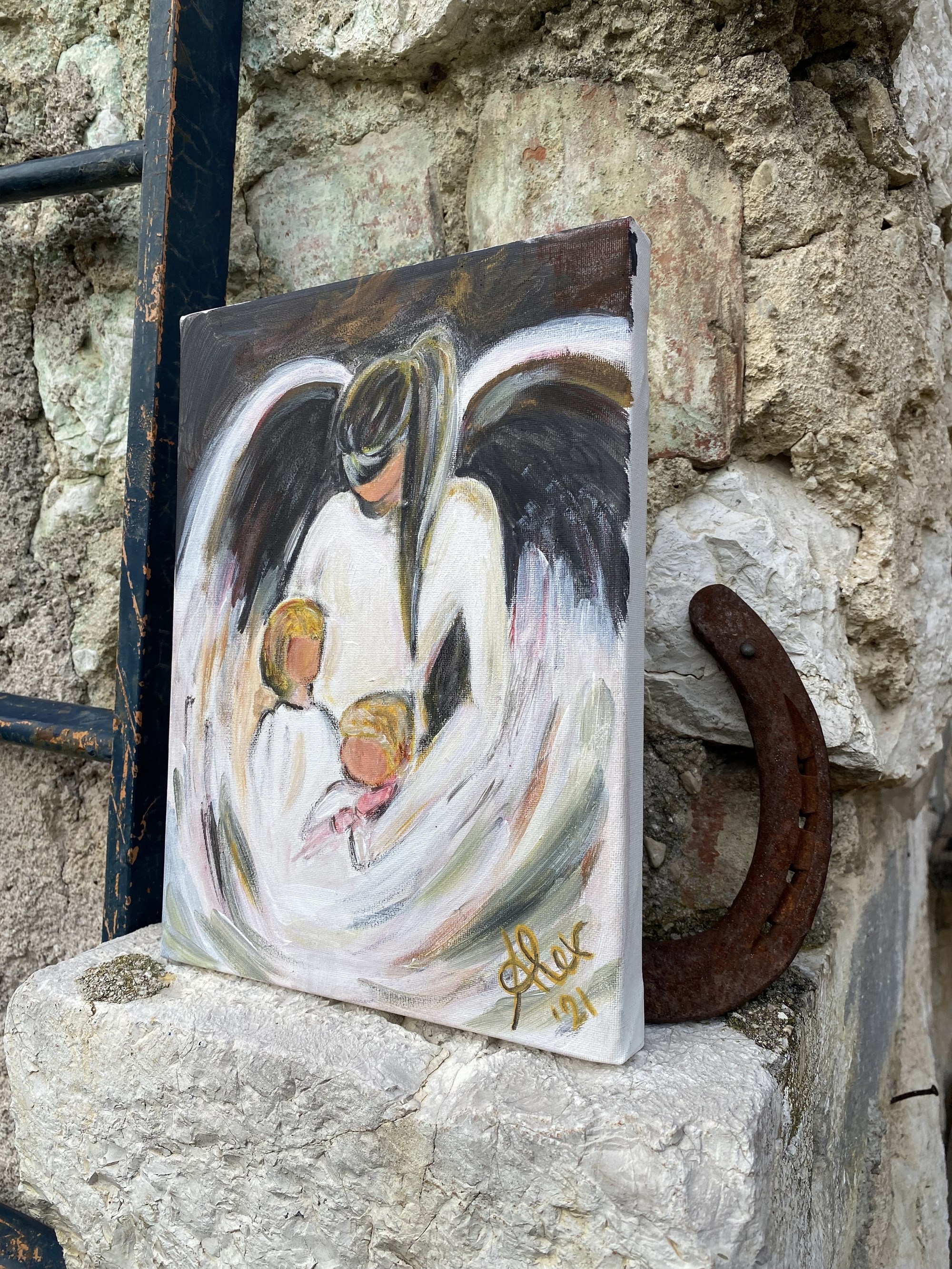 Chi lo ha detto che gli angeli custode sono solo figure maschili? Acrilico su legno 13 x 18 cm