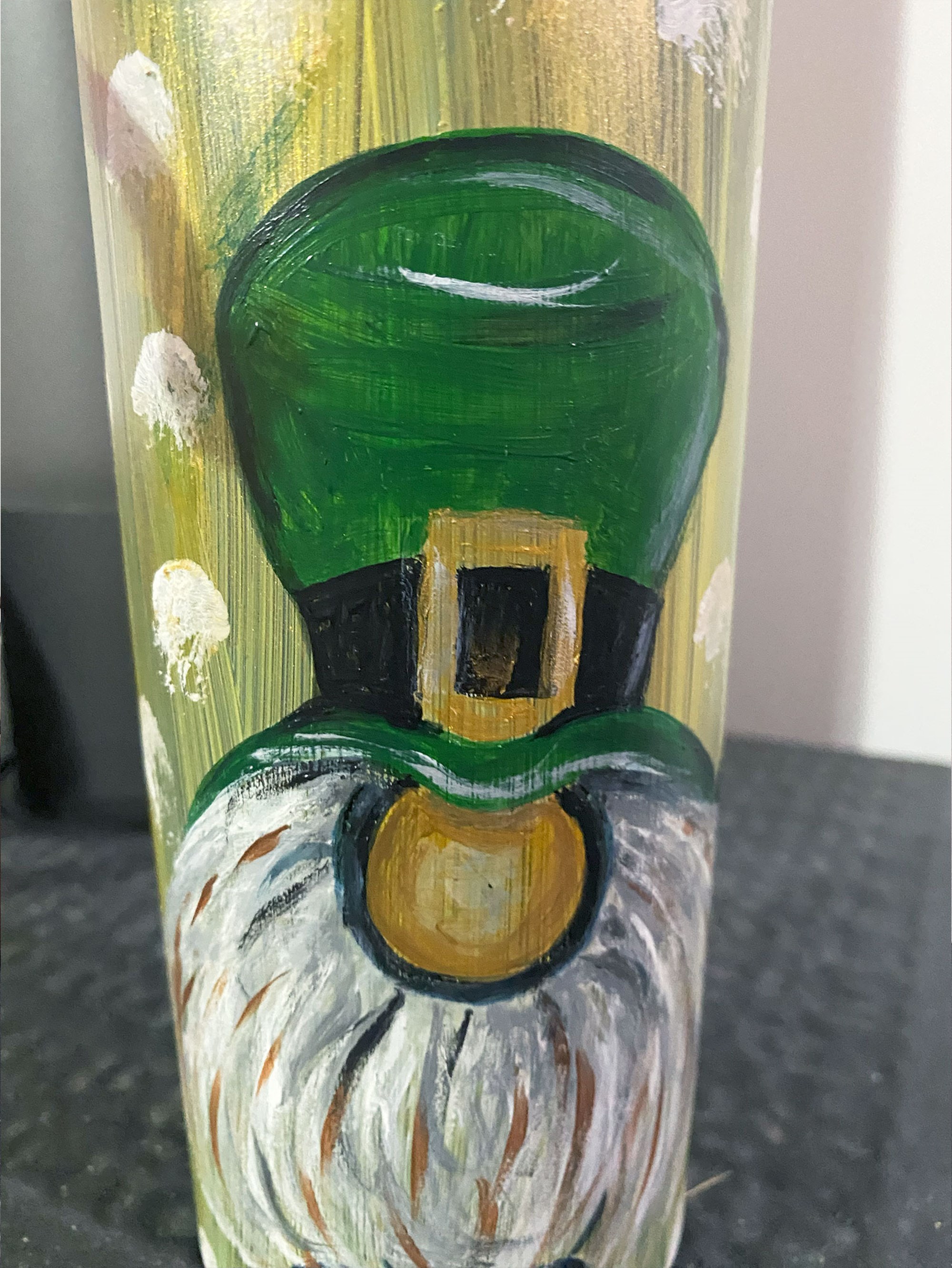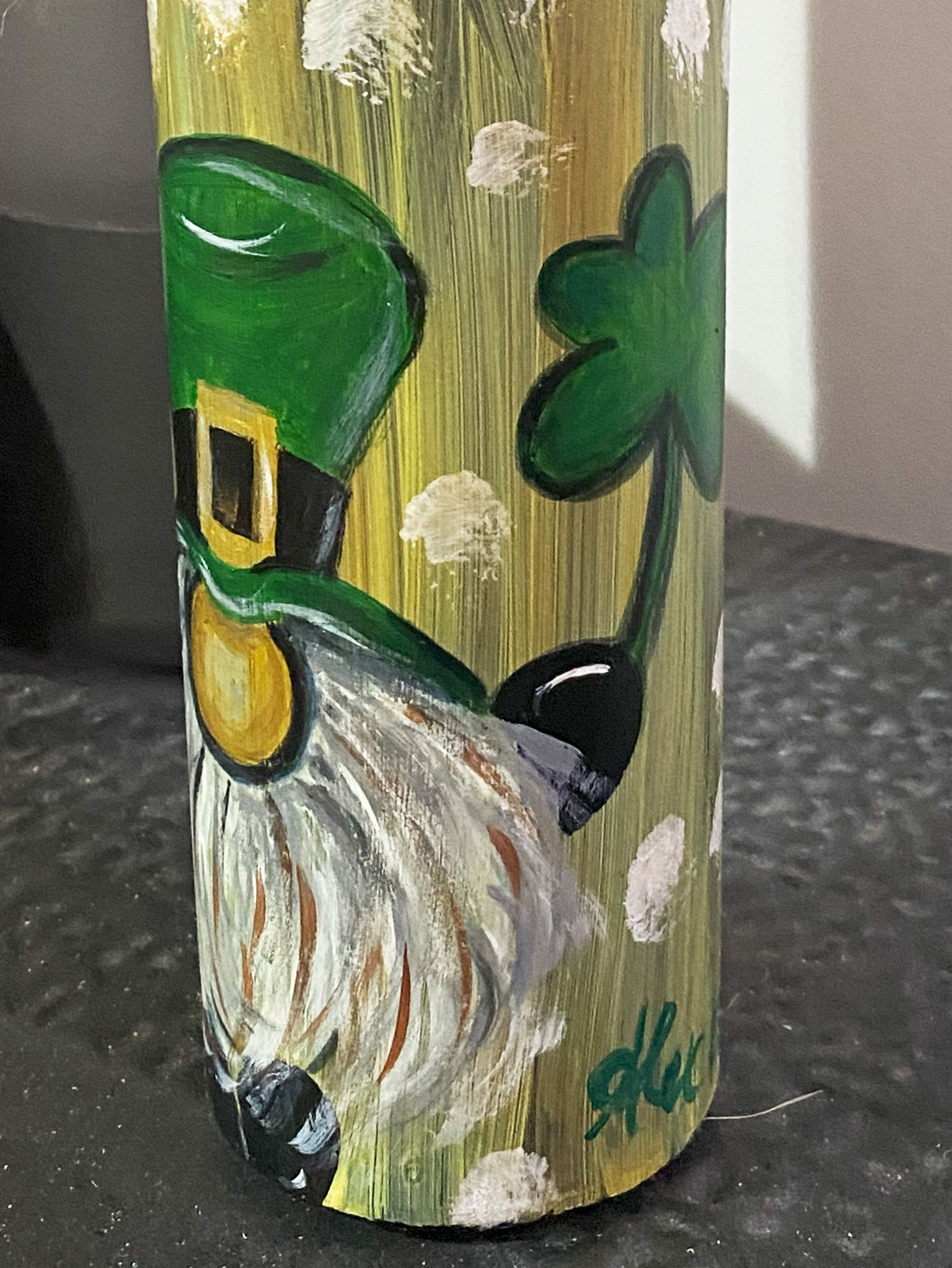 Con ogni pennellata, ho cercato di infondere in questo gnomo un animo allegro, la quintessenza dell'ottimismo. Ogni sfumatura di verde nel suo cappello è un inno alla vita, ogni filo bianco della sua barba è una storia di saggezza antica, e il quadrifoglio che tiene stretto è la promessa che, nonostante tutto, la fortuna può trovare la strada per arrivare a chiunque.