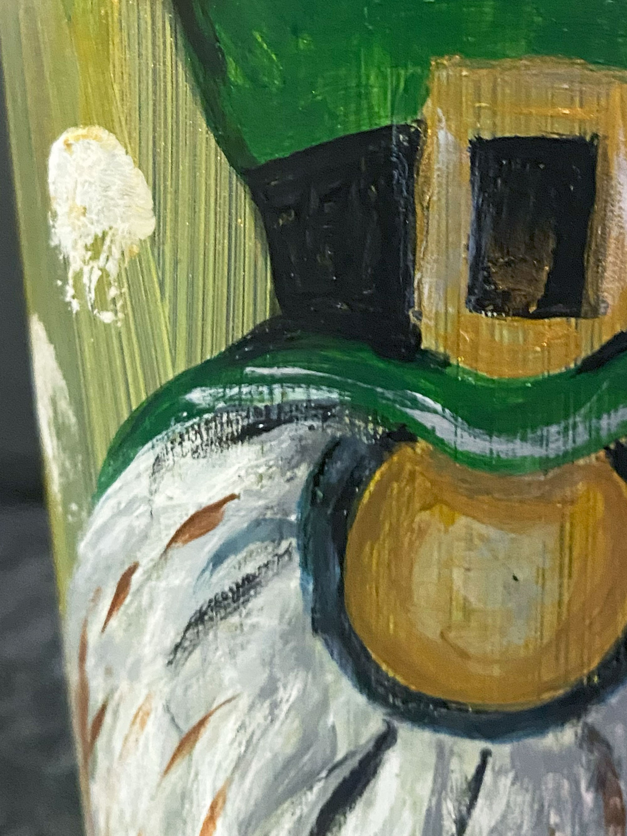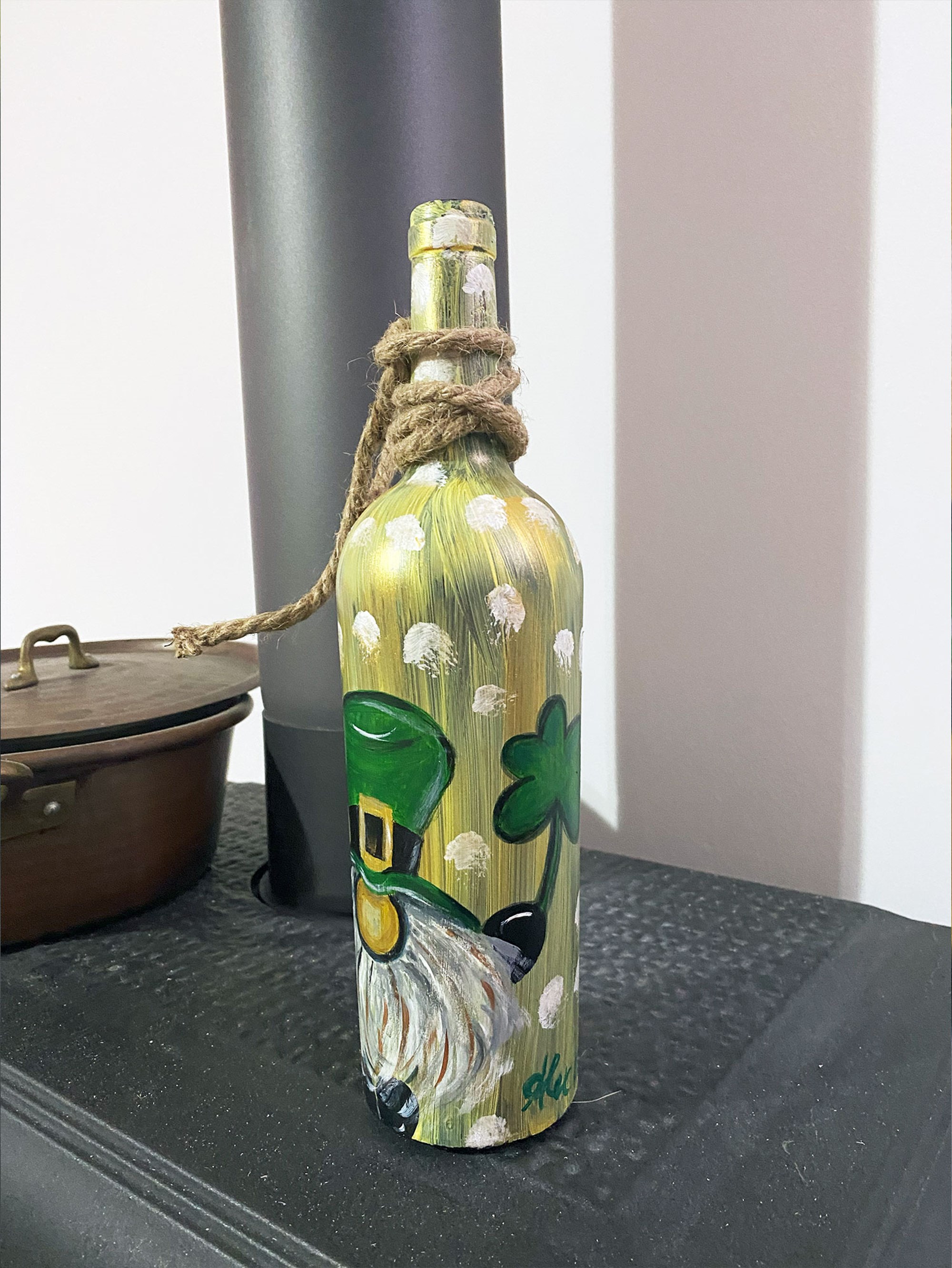 Nella quiete del mio studio, tra il profumo della pittura fresca e il silenzio che avvolge i miei pensieri, ho dato vita a un piccolo guardiano della fortuna: un simpatico gnomo che, con un sorriso beffardo e un occhio ammiccante, stringe tra le mani il simbolo universale della speranza, un quadrifoglio.