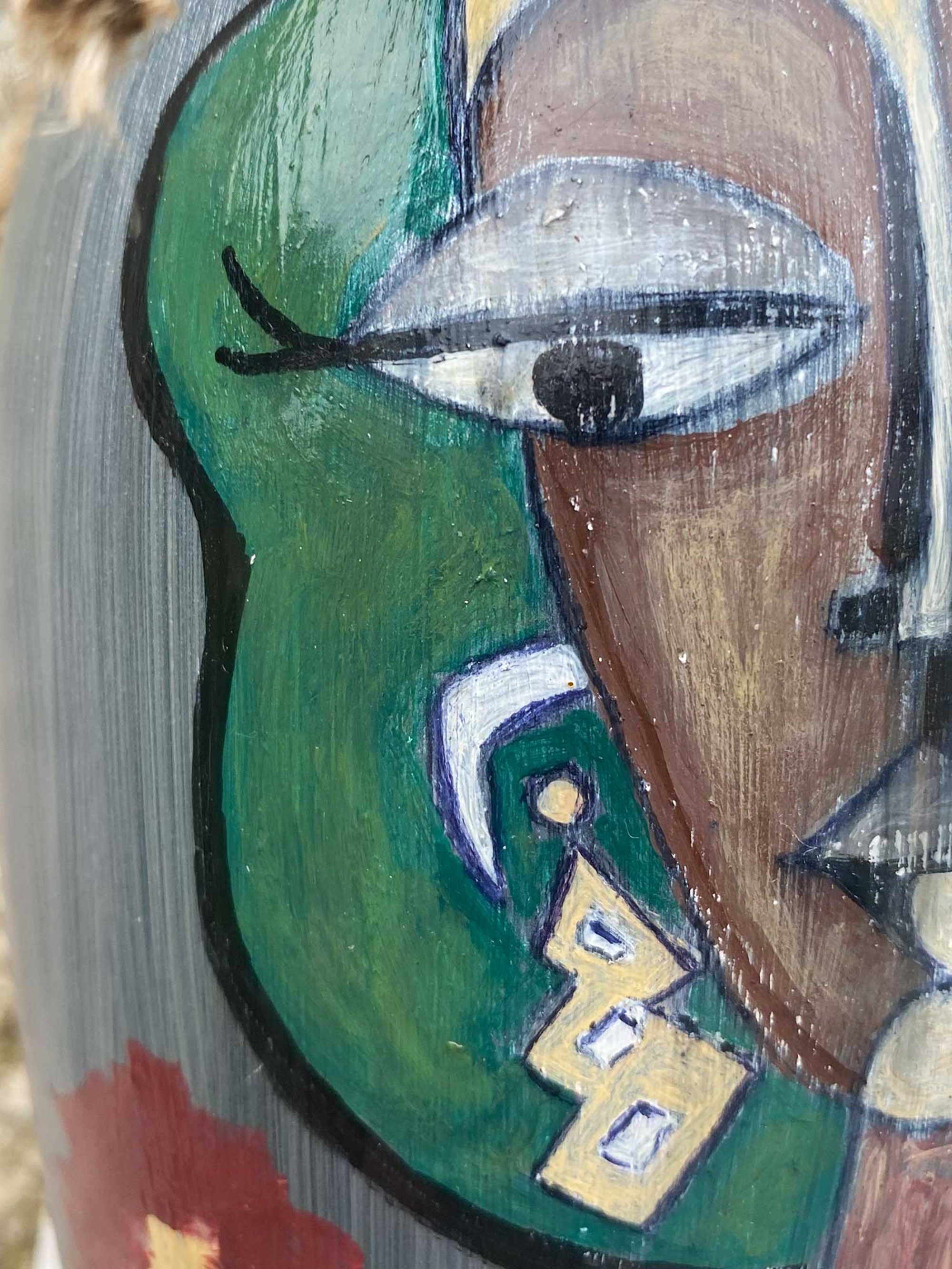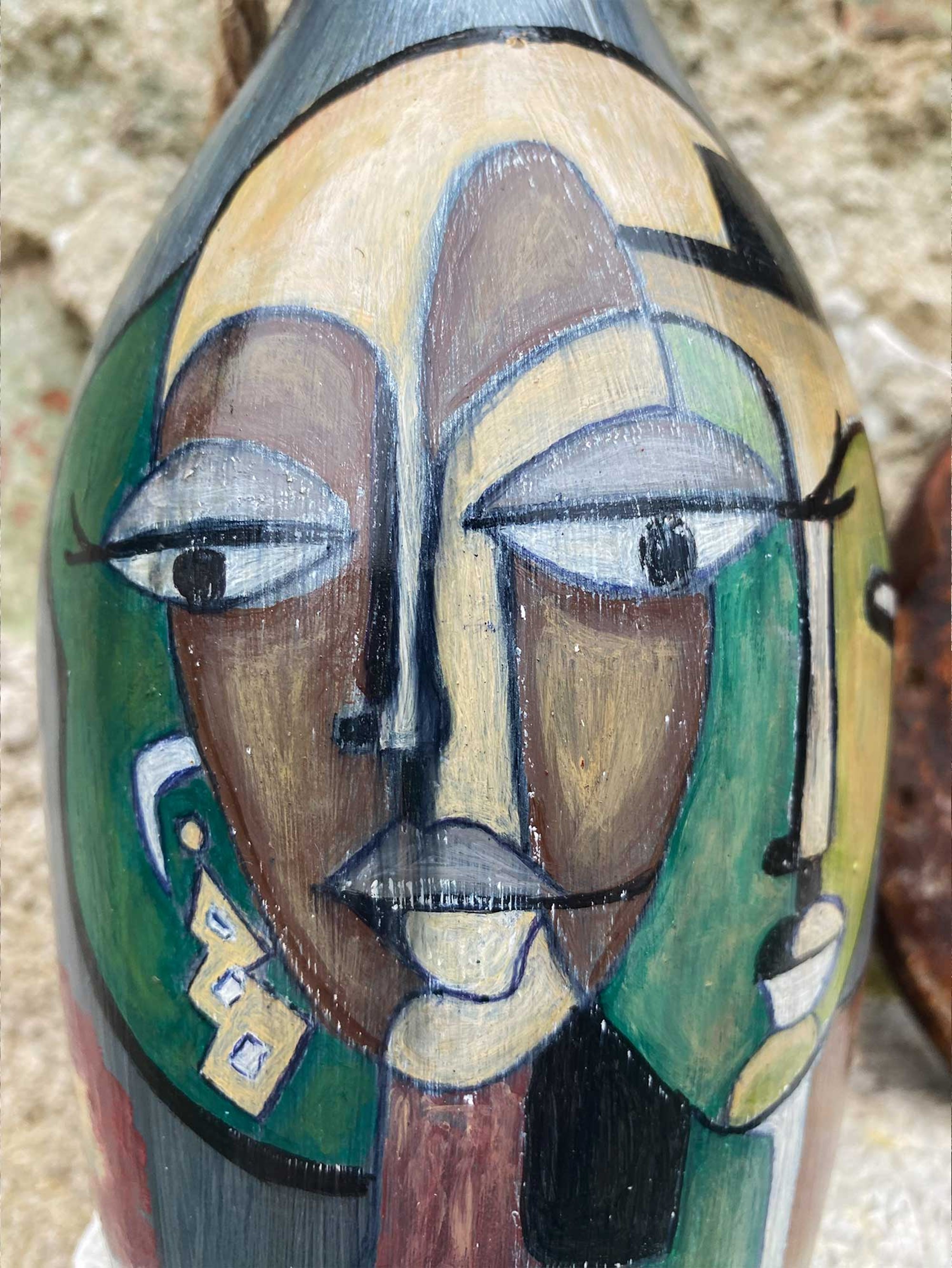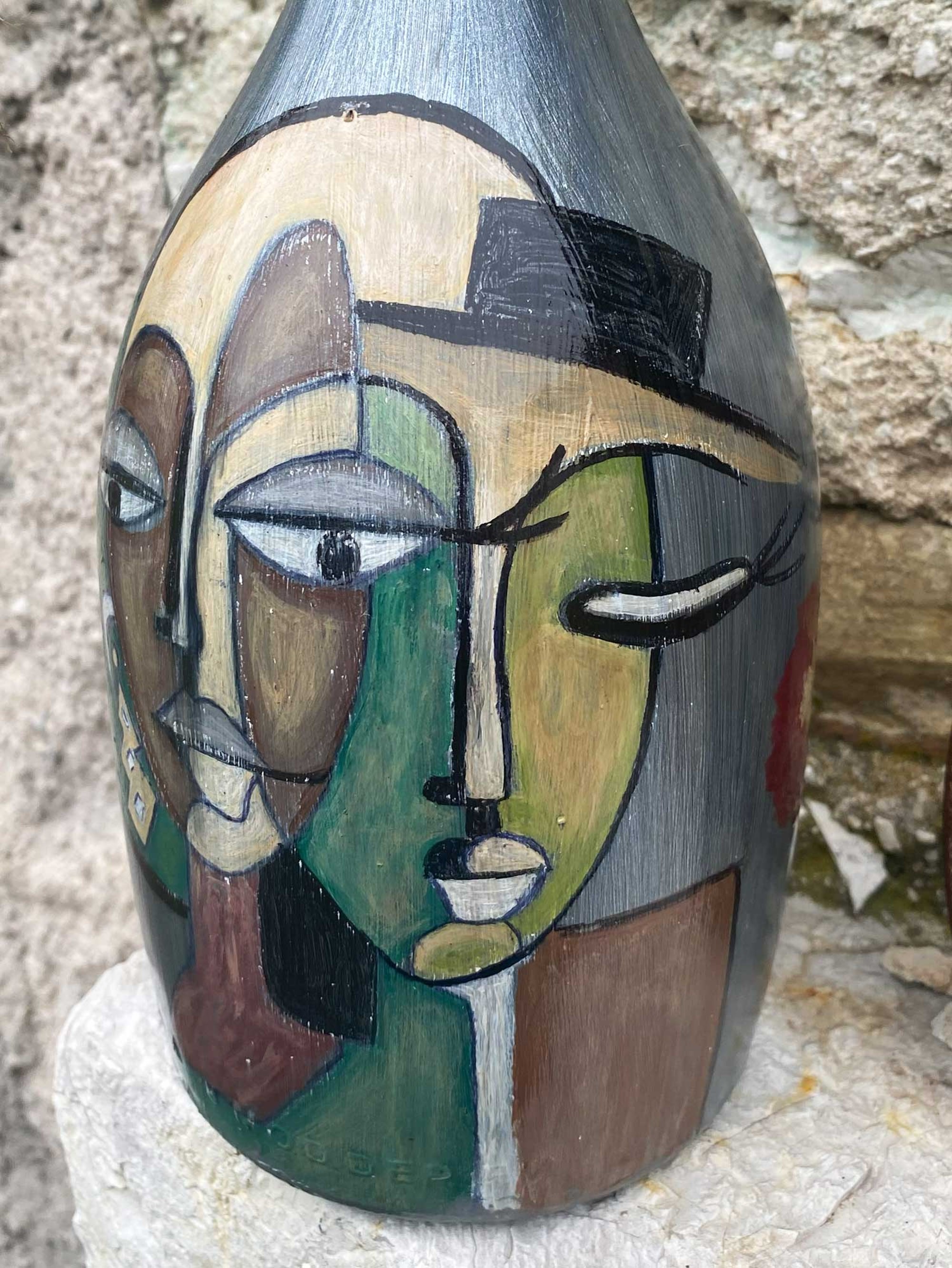 Questa bottiglia dipinta è più di un oggetto d'arte; è una narrazione visiva, un dialogo silenzioso con l'osservatore, invitandoti a riflettere su quale dei tre volti risuona di pi ... altro>>