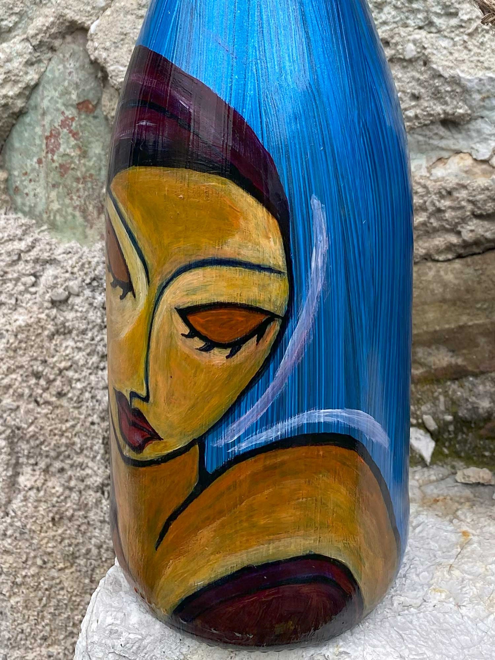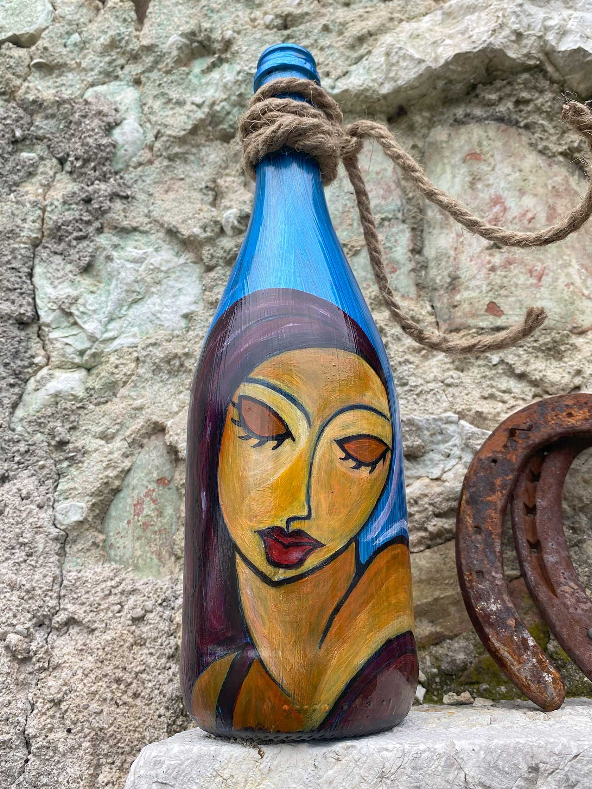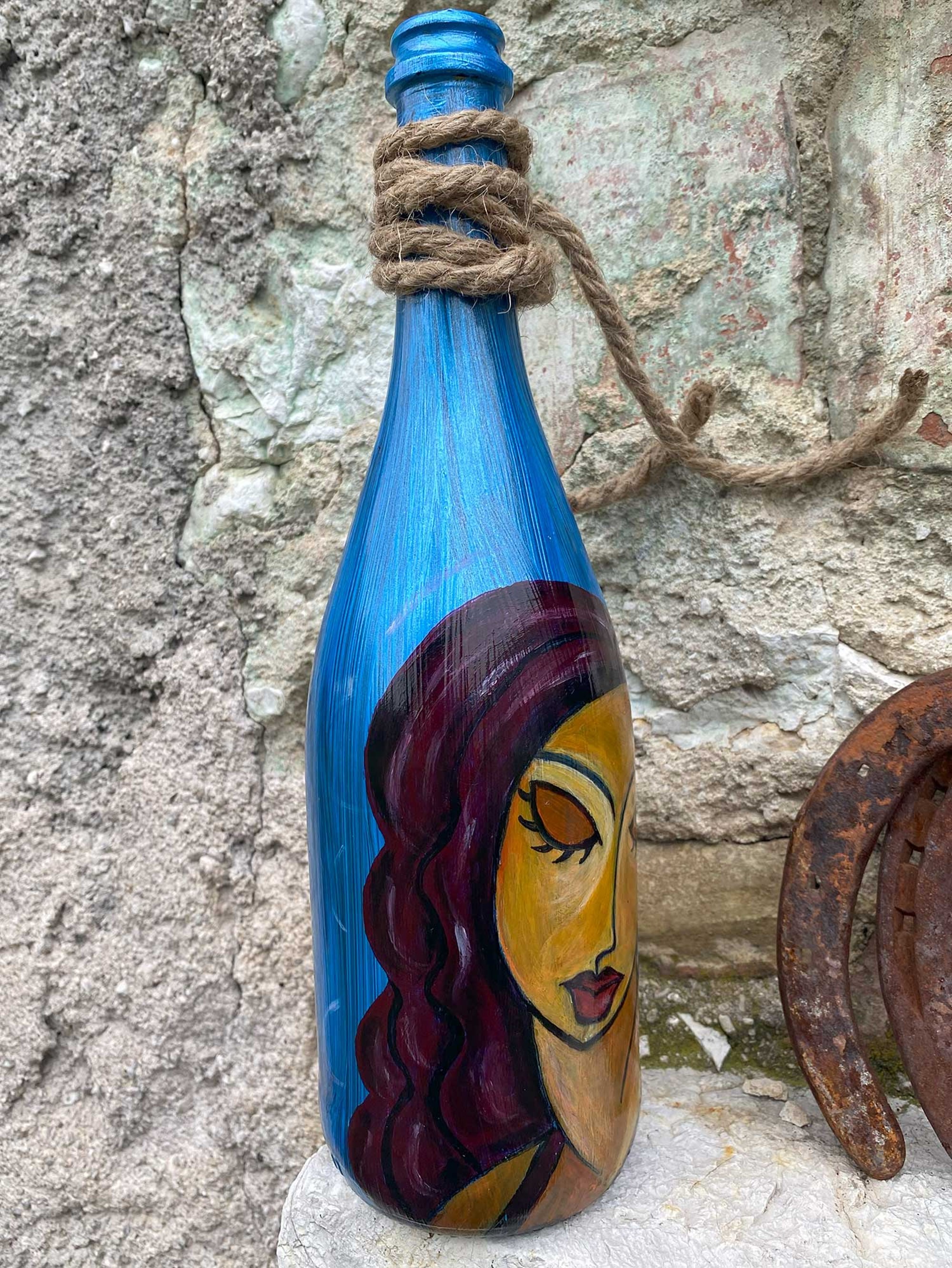 Guardate questa bottiglia, un oggetto che ho trasformato con le mie mani in un racconto di colori e forme. Su di essa, ho dipinto due donne, entrambe parte di me, parte delle stori ... altro>>