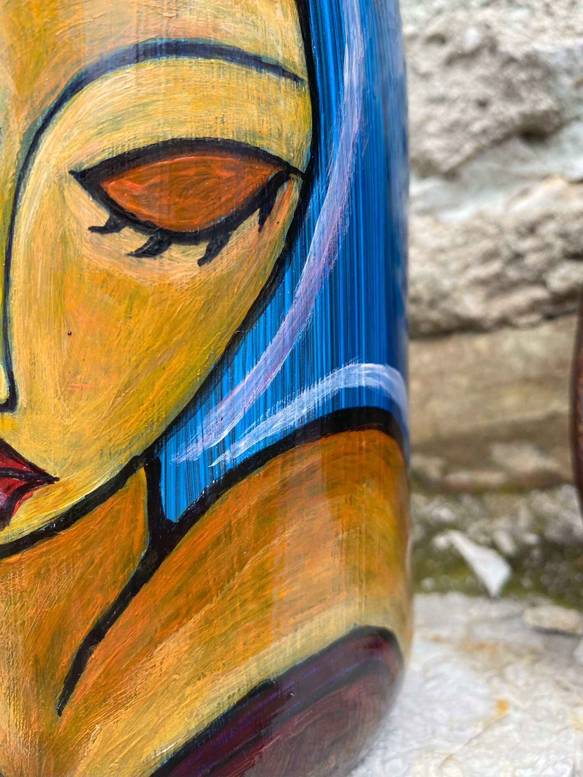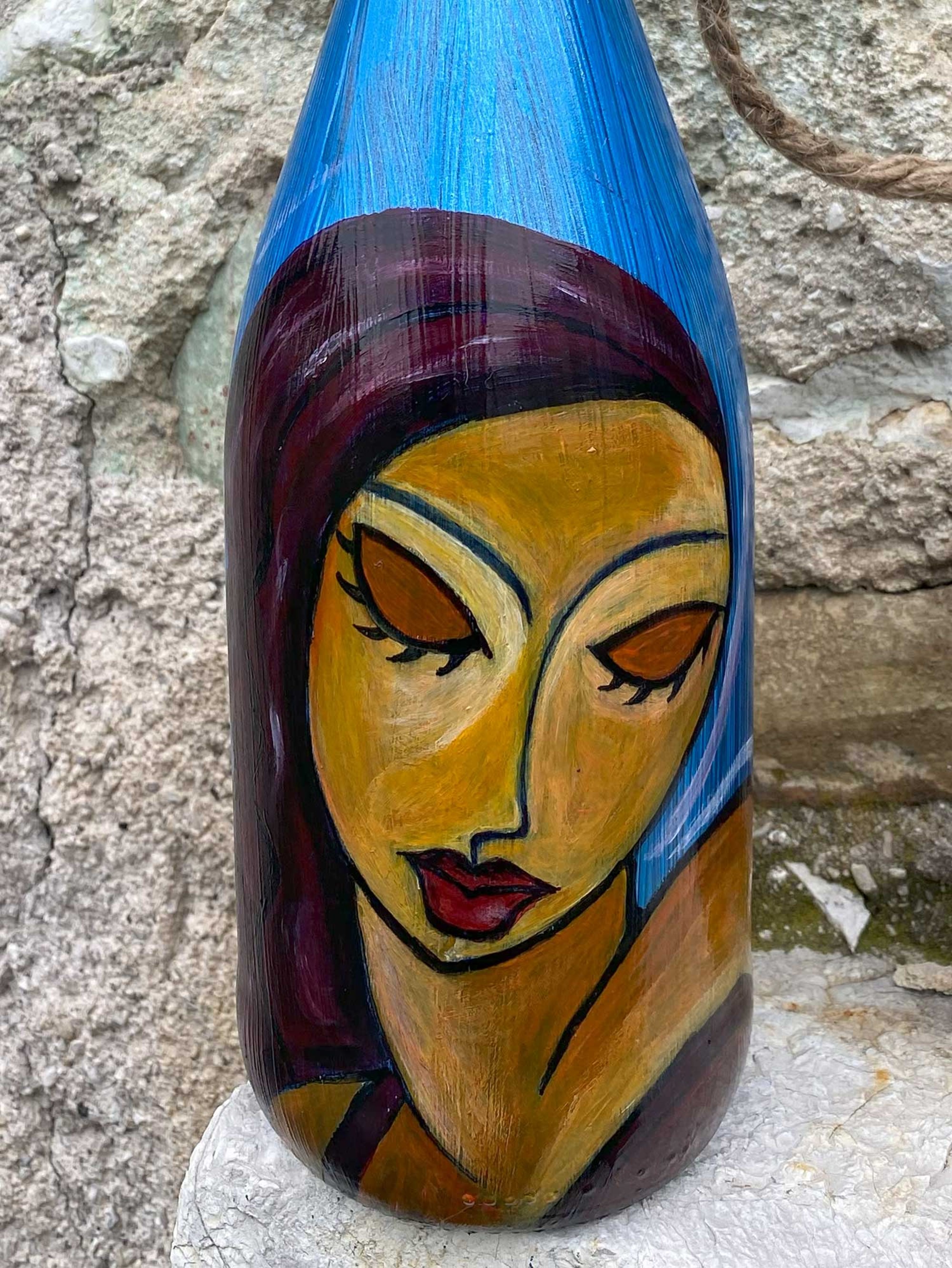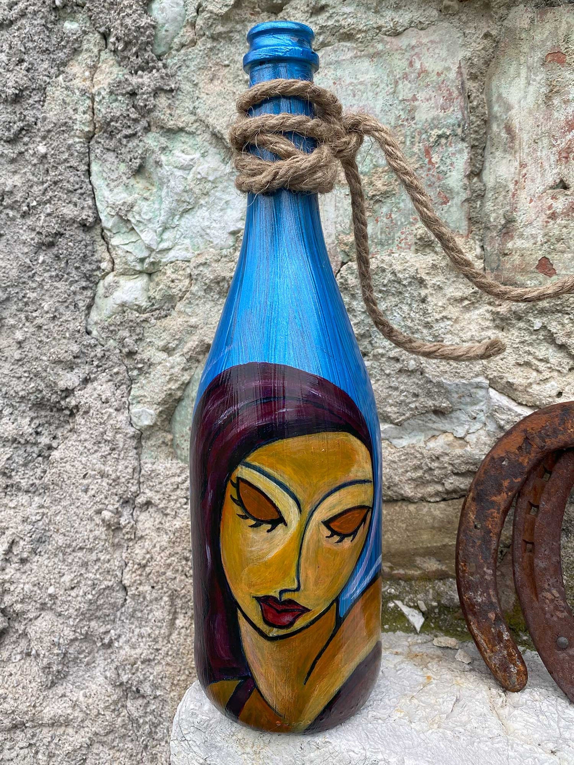 Guardate questa bottiglia, un oggetto che ho trasformato con le mie mani in un racconto di colori e forme. Su di essa, ho dipinto due donne, entrambe parte di me, parte delle stori ... altro>>
