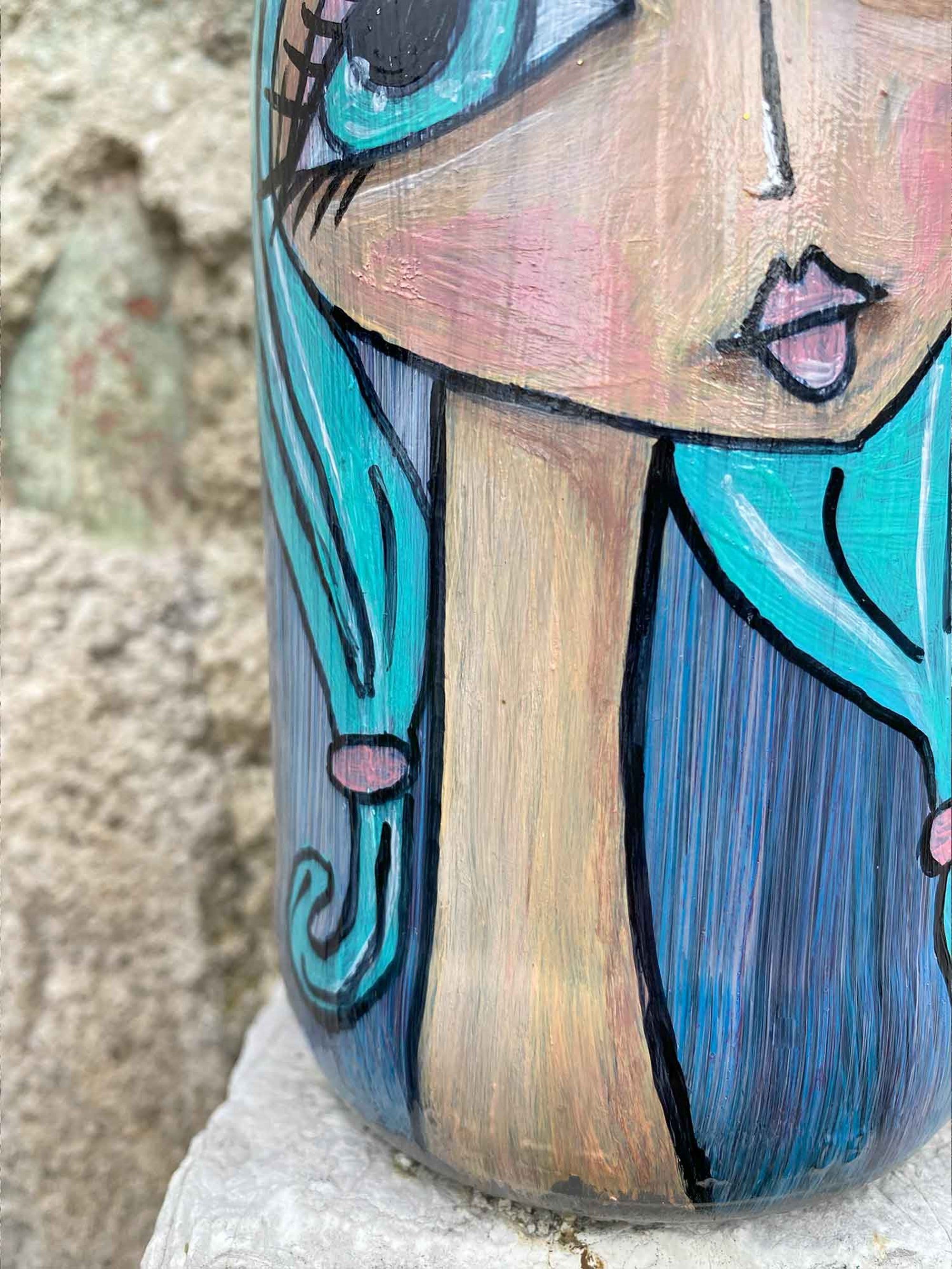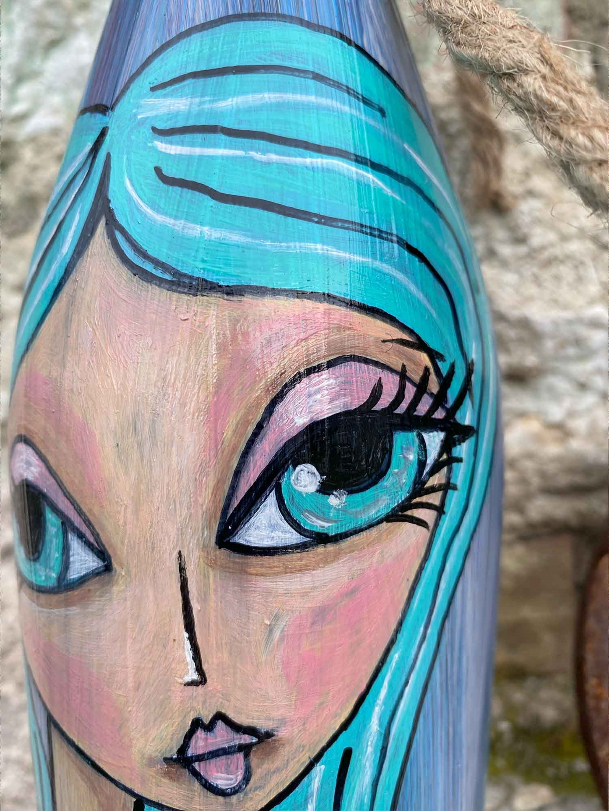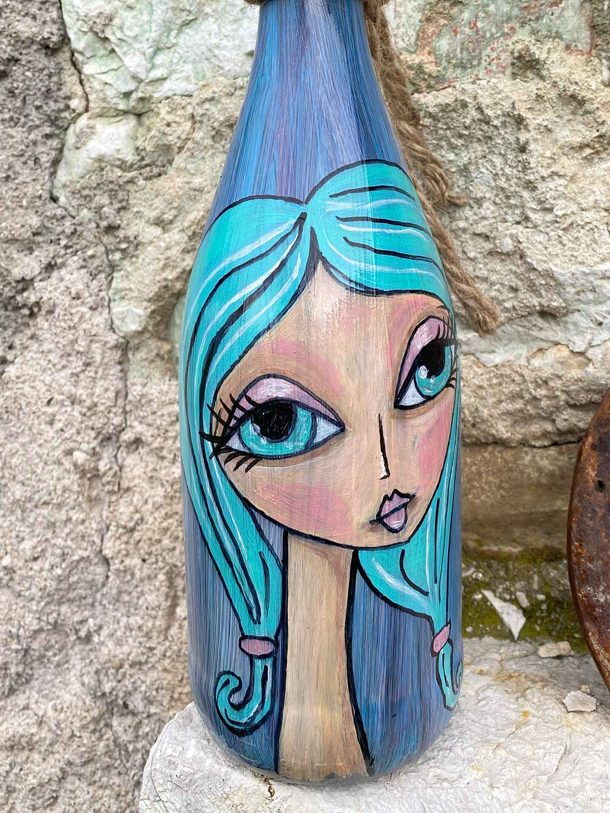 In questa immagine c'è una bottiglia trasformata in tela per un'opera d'arte unica e poetica. Su di essa è dipinta una donna dai lunghi capelli di un turchese intenso, che fluttuano dolcemente attorno al suo viso pallido. I suoi occhi, ampi e pieni di sogni, fissano nel vuoto, quasi a cercare risposte in un mondo lontano. C'è una delicatezza nei suoi lineamenti, una dolcezza nel suo sguardo pensieroso, che porta a chiedersi quali siano le storie nascoste dietro quegli occhi.
