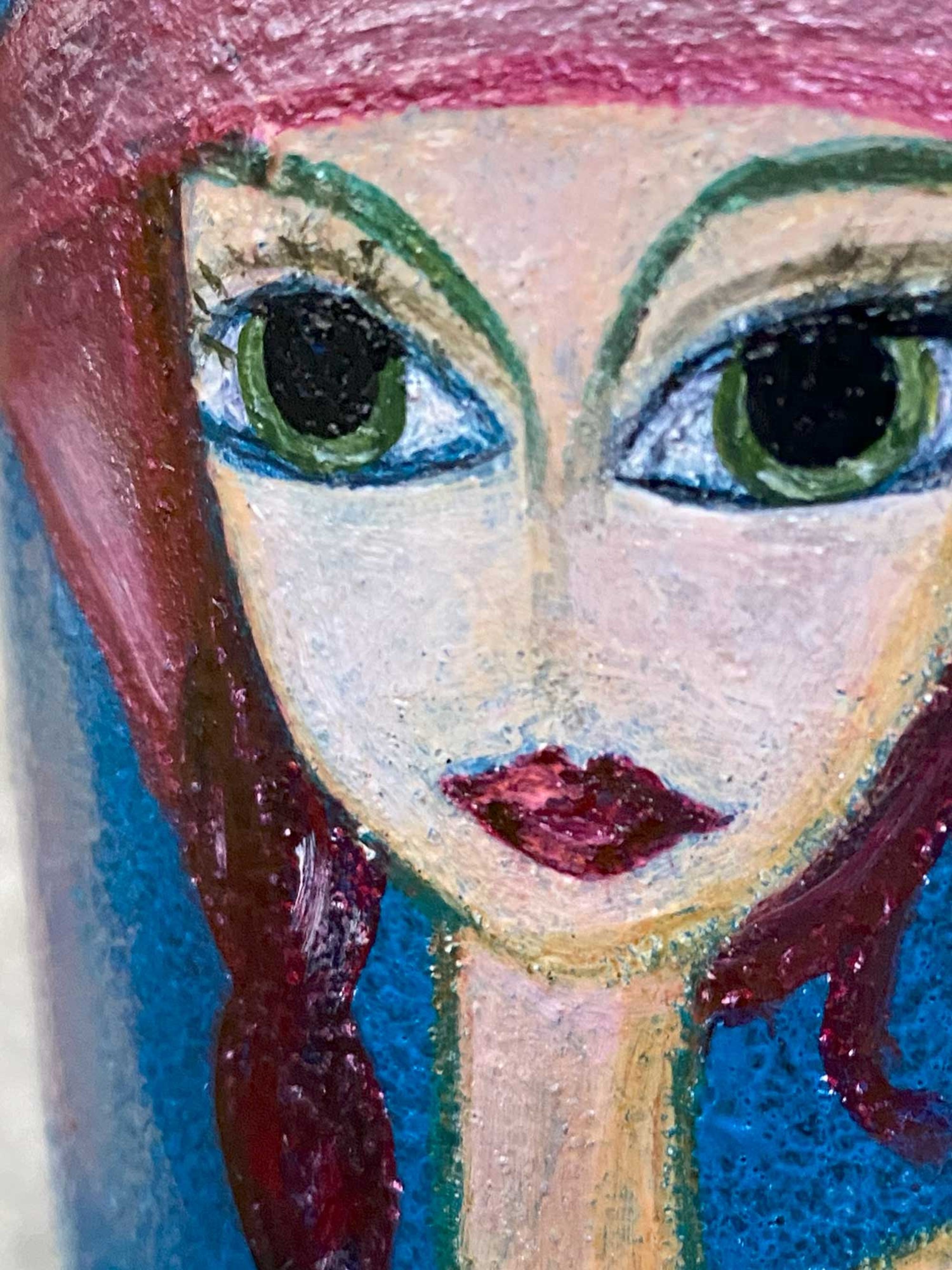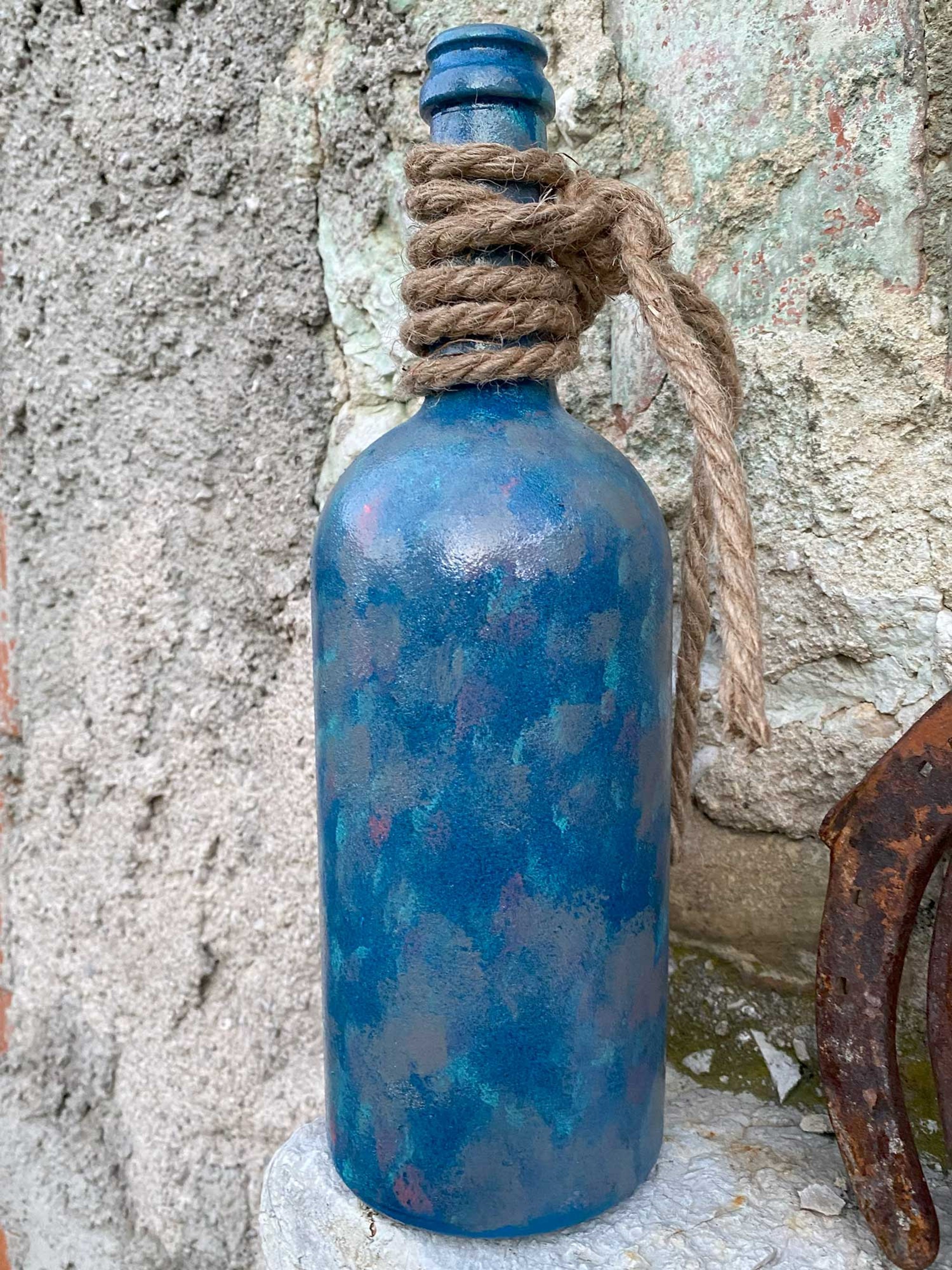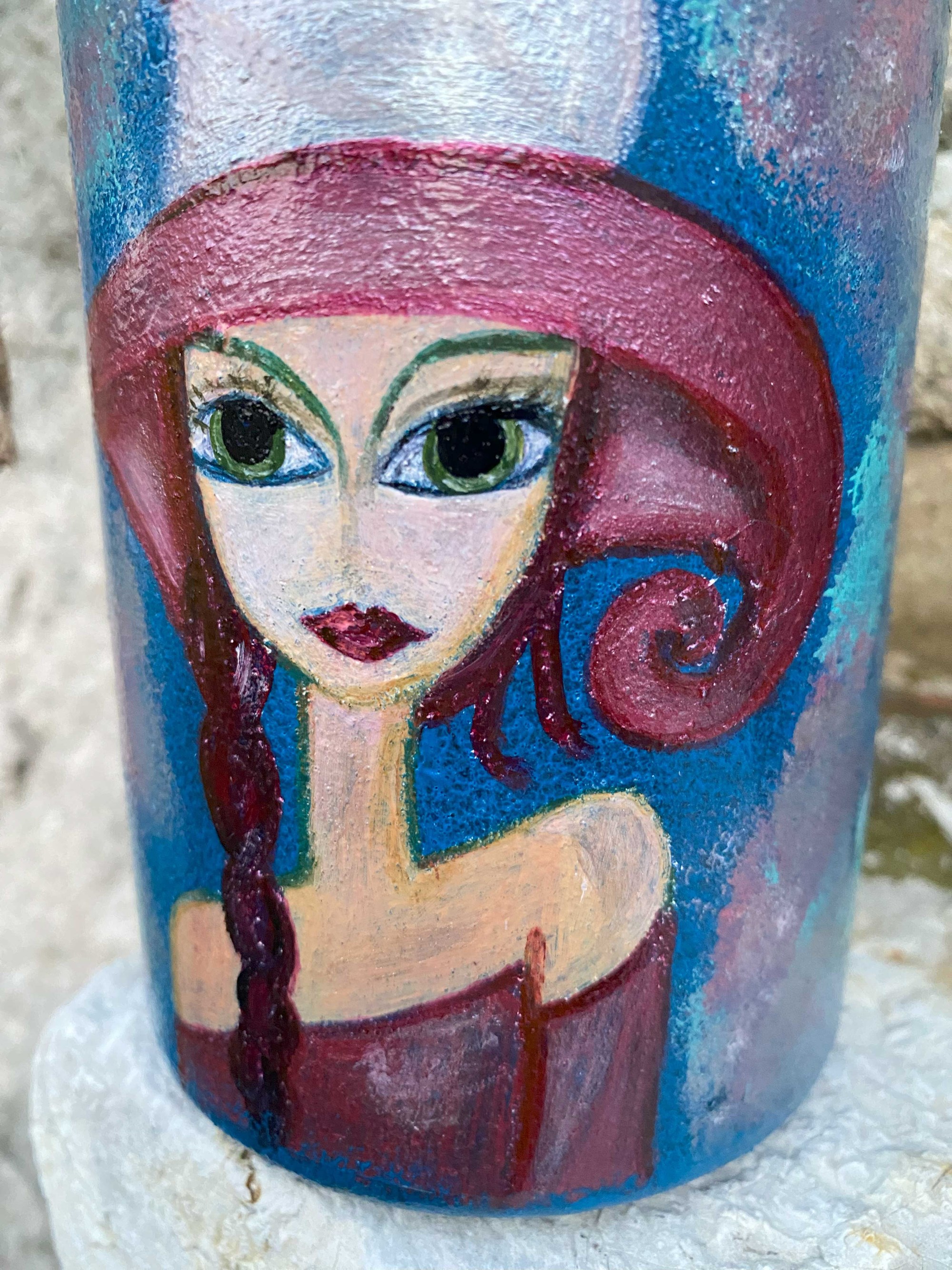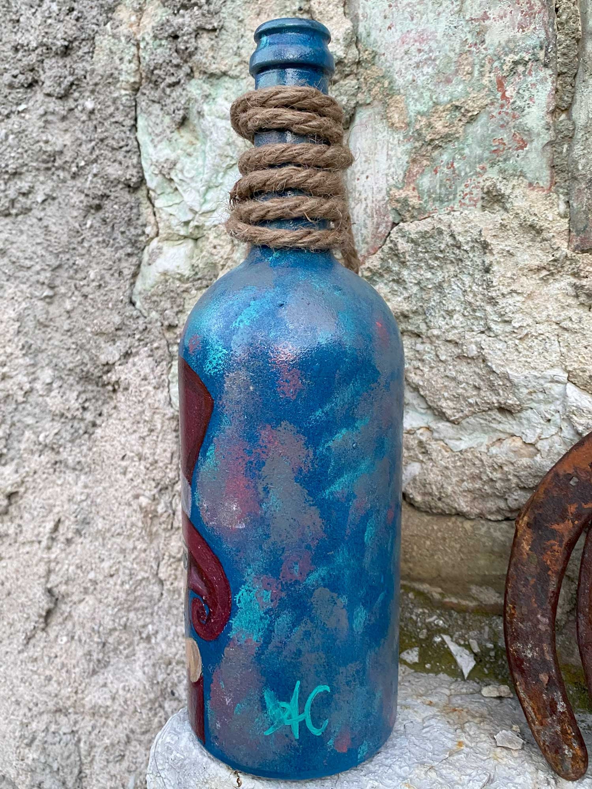 Guardate questa bottiglia, un oggetto che ho trasformato con le mie mani in un racconto di colori e forme. Su di essa, ho dipinto due donne, entrambe parte di me, parte delle stori ... altro>>