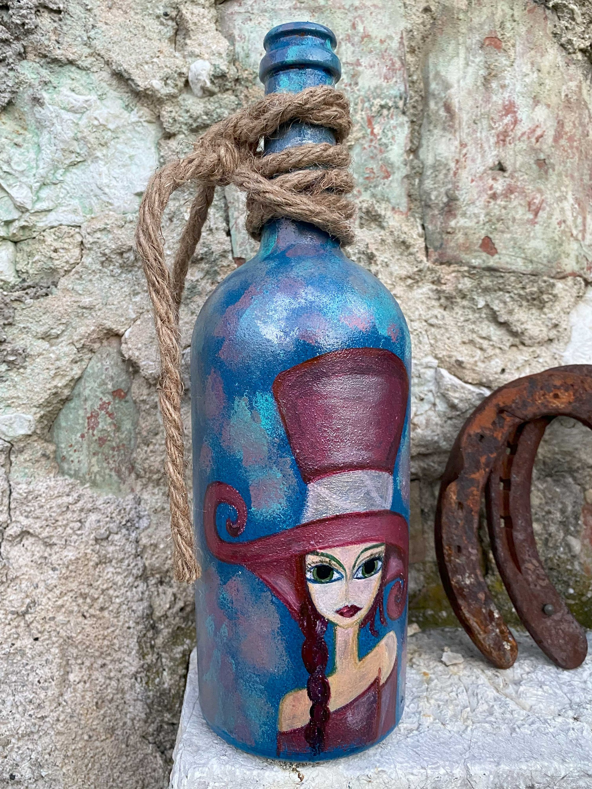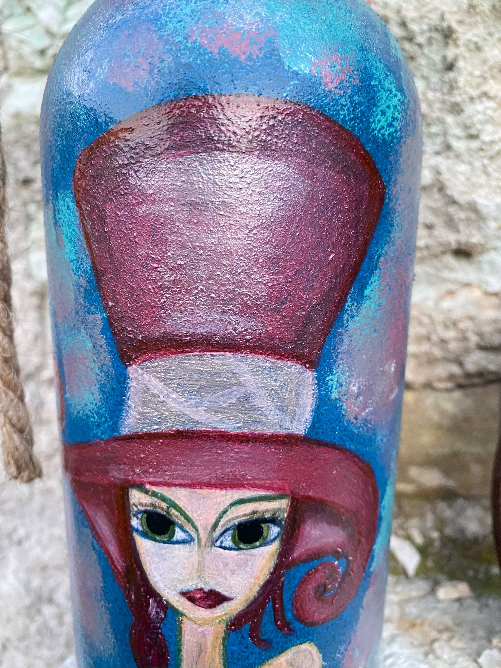 Ho scelto di dipingere su questa bottiglia artistica una figura che incarna l'eleganza con un tocco di eccentricità; un'immagine che cattura l'essenza di uno spirito libero, confinato in un mondo di forme e aspettative.