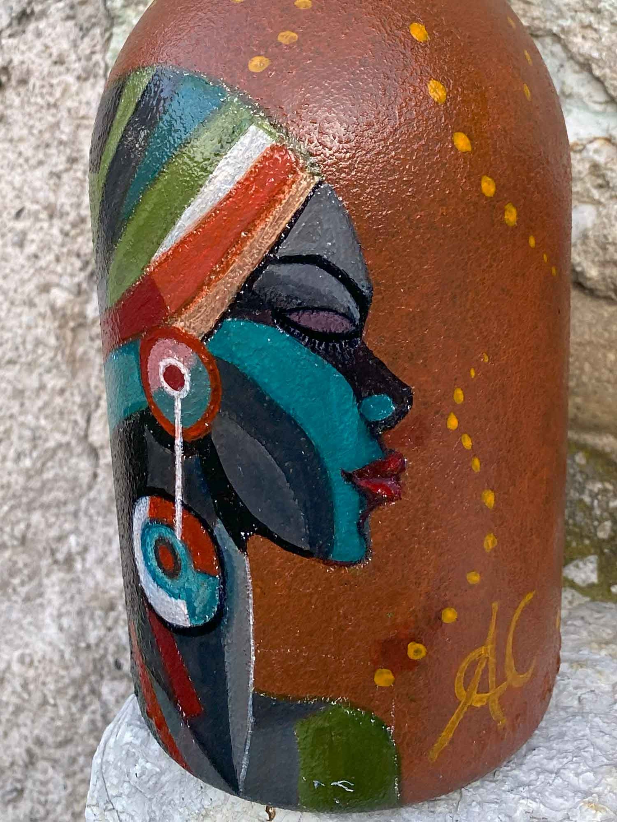 Nel cuore di questo dipinto su bottiglia, ho dato vita a una visione che connette il passato ancestrale con il presente vibrante. La protagonista è una donna pellerossa, una figura emblematica della ricca eredità nativa d'America, ma rivisitata attraverso un prisma moderno che sfida i confini del tempo.