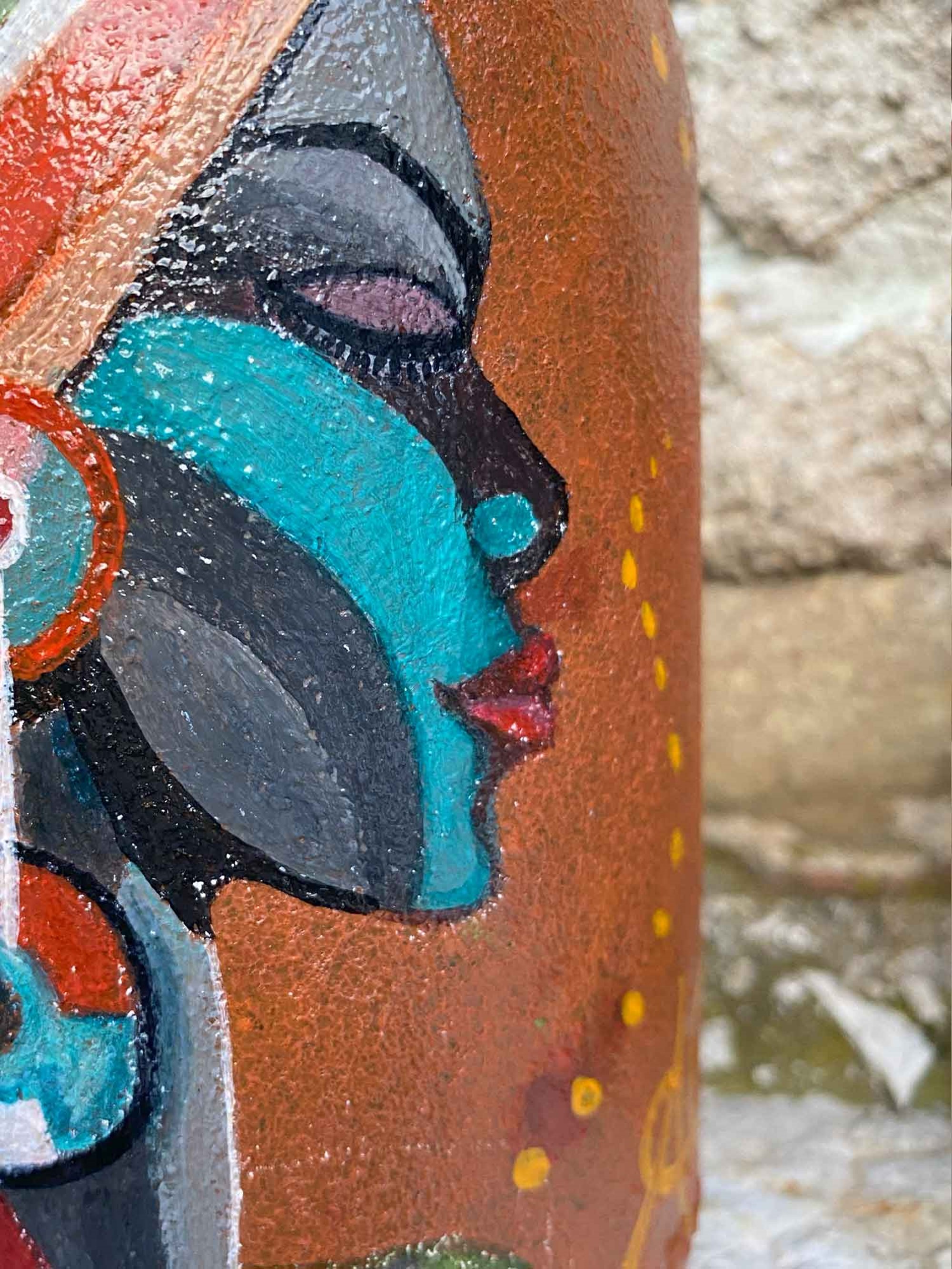 La testa della donna è un caleidoscopio di tinte: striature di marrone, verde e azzurro si mescolano creando un effetto multicolore, che culmina in una coda di cavallo, simbolo di forza e libertà senza tempo. Ogni tratto del suo viso racconta una storia di resilienza, saggezza e una bellezza che trascende le epoche.